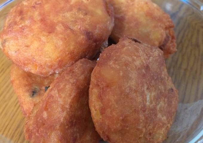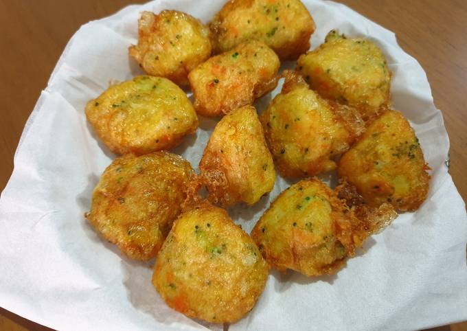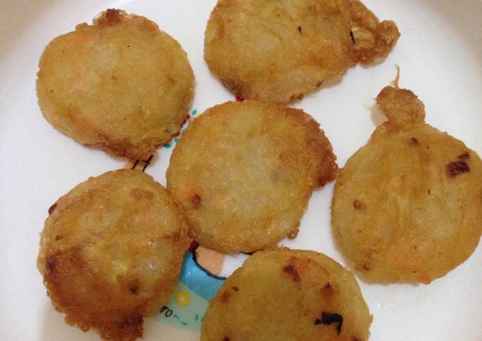 Lihat juga resep Menu Anak. Bentuk menjadi bentuk perkedel. Balut adonan perkedel dengan tepung terigu lalu goreng dengan minyak secukupnya.
